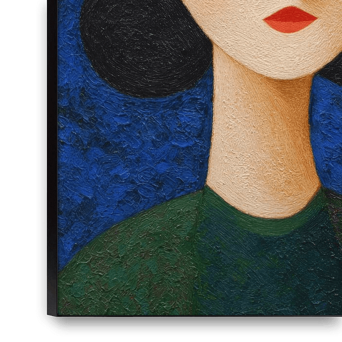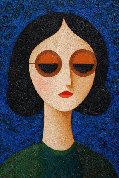 A stylised portrait in which simplicity and graphic design come together. The large, rounded shapes around the eyes give the image a distinctive, almost iconic quality. The deep blue background enhances the contrast with the warm skin tones and red lips. The closed eyes lend the work a calm, introspective atmosphere.
