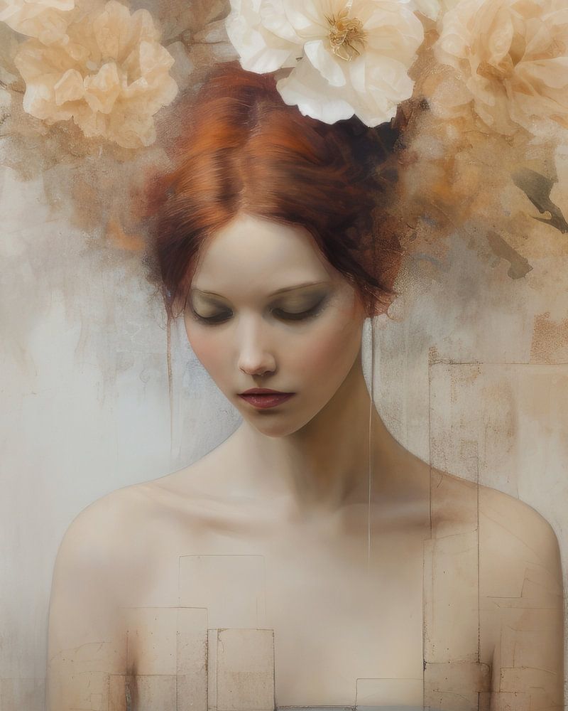 Portrait with flowers in wabi-sabi style. Pastel colours. In traditional Japanese aesthetics, wabi-sabi is a worldview centred on the acceptance of impermanence and imperfection. The aesthetic is sometimes described as an appreciation of beauty that is "imperfect, impermanent and incomplete" in nature. It is common in many forms of Japanese art.