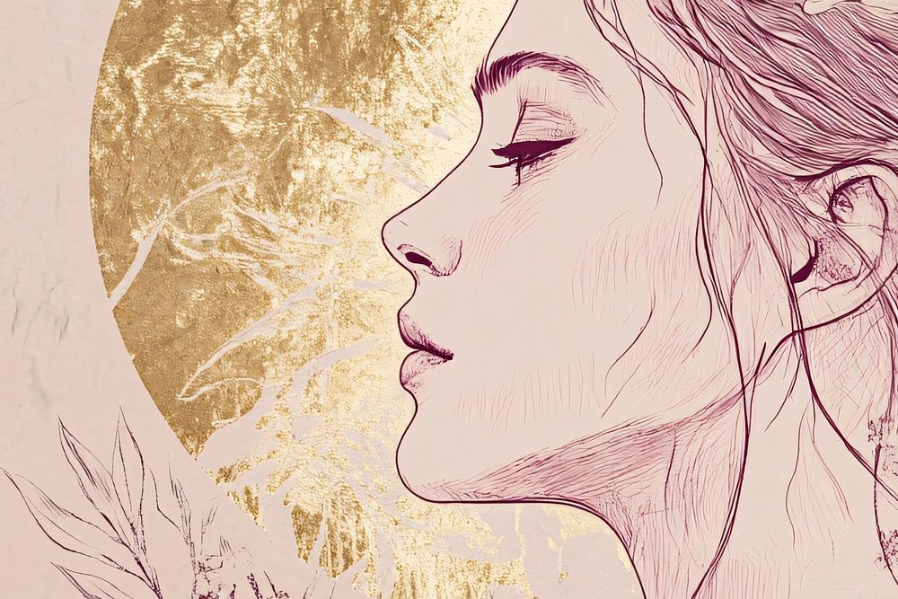 An elegant artwork that captures the beauty of femininity. The portrait shows a woman with soft features, surrounded by delicate flora and topped with a golden halo that enhances her radiance. The pale pink and beige tones give the design a calm, timeless look, while the gold accents add a touch of luxury. Perfect for spaces where sophistication and harmony are desired, such as a bedroom or dining room. A wonderful choice for lovers of modern and minimalist art.