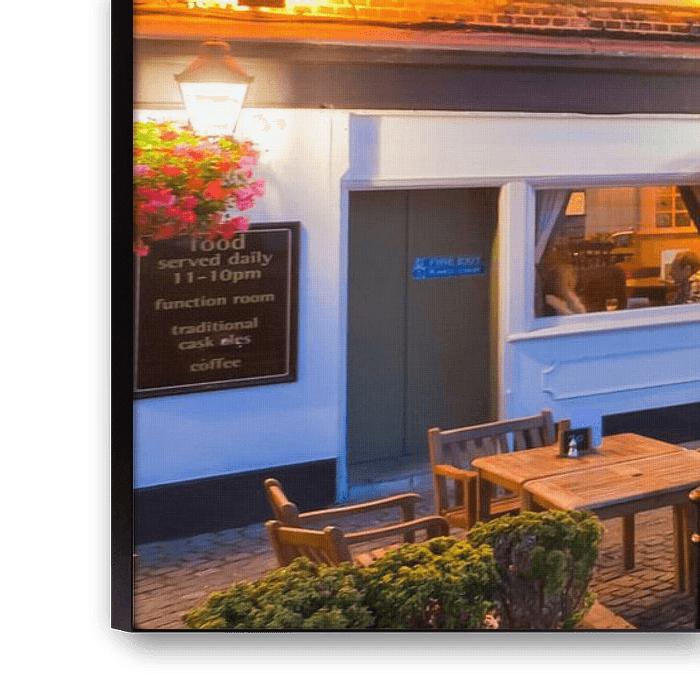 Pubs on the harbour promenade in the old town of Portsmouth at night.