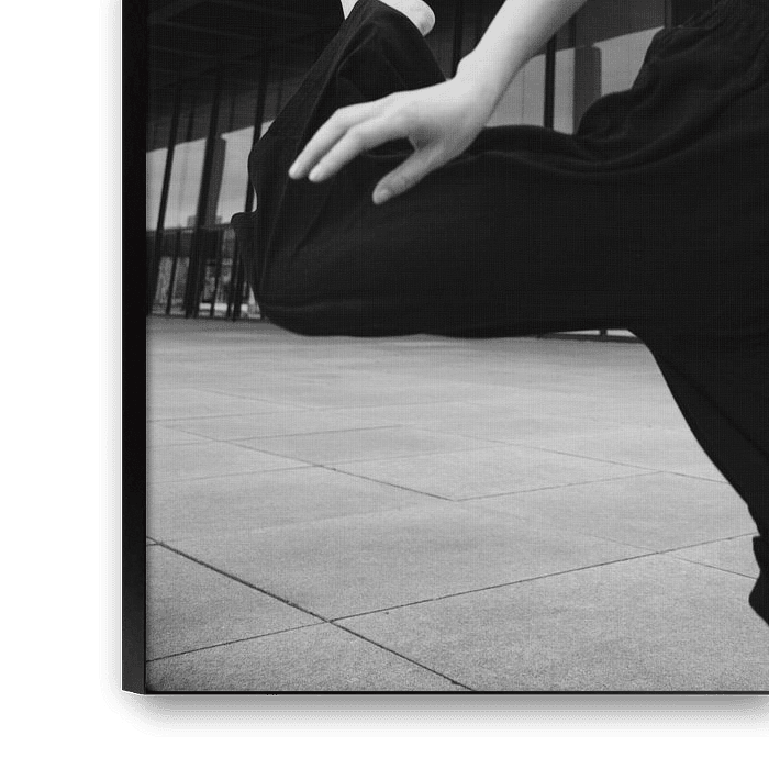 The picture shows a dancer performing with a powerful pose on the forecourt of an iconic cubic glass building. Her black dress sways to the rhythm of the movement, while the architecture behind her with its clear lines and modern forms offers an exciting contrast to the organic dynamics of the dance. The angle of view simultaneously emphasises width and focus, the dancer's expression appears intense and at peace with herself. The composition reflects the balance between artistic freedom and architectural rigour - urbanity meets emotion, space meets energy. The black and white aesthetic emphasises the refined simplicity of this moment. This image is perfect for art lovers, dance enthusiasts and fans of modern photographic art. It brings inspiration, balance and a touch of urban elegance to any room and is particularly appealing to people who are passionate about the connection between people, art and the metropolis.