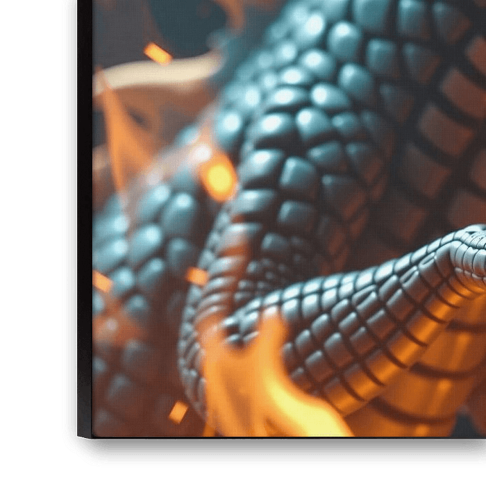 Fearsome black and gold dragon breathing fire surrounded by flames on a dark background