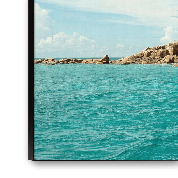Seychellen: zon, zee, strand: tropische afbeelding van een onbewoond eiland in een prachtig helder blauwe zee met rotsen en palmen.