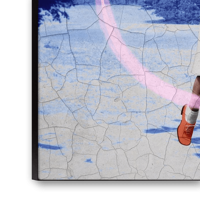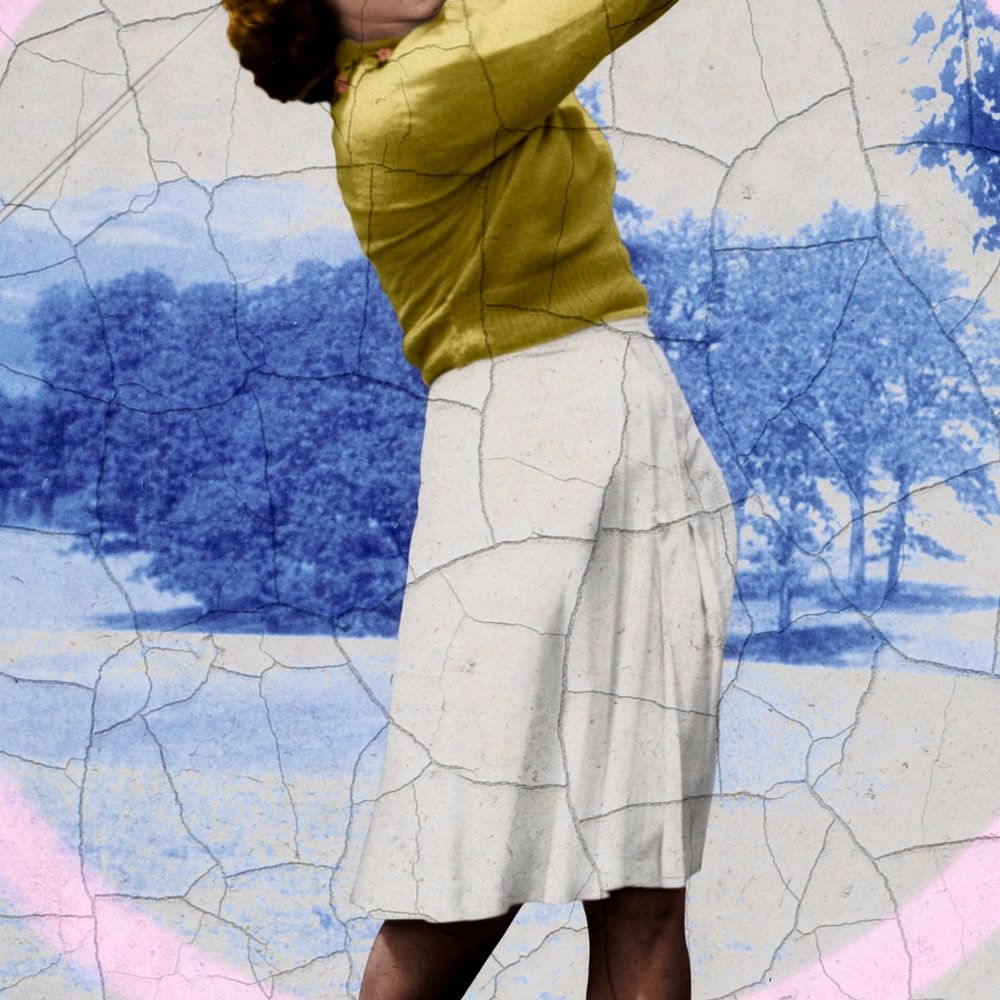 This cheerful vintage golf star is seriously practising her swing circle. Using the crackle effect, I decided to set the golf star in a Delft blue-coloured golf landscape that frames her. Also to give the whole thing a Dutch look. The two images blend together but are actually separate. The sun visor was digitally drawn by me.