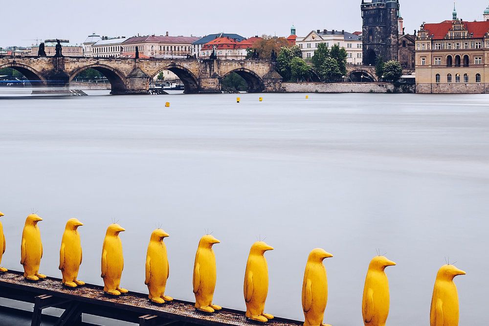 The photo is showing the Yellow Penguins by the ‘Cracking Art Group’ at the Museum Kampa and the Charles Bridge in the background.