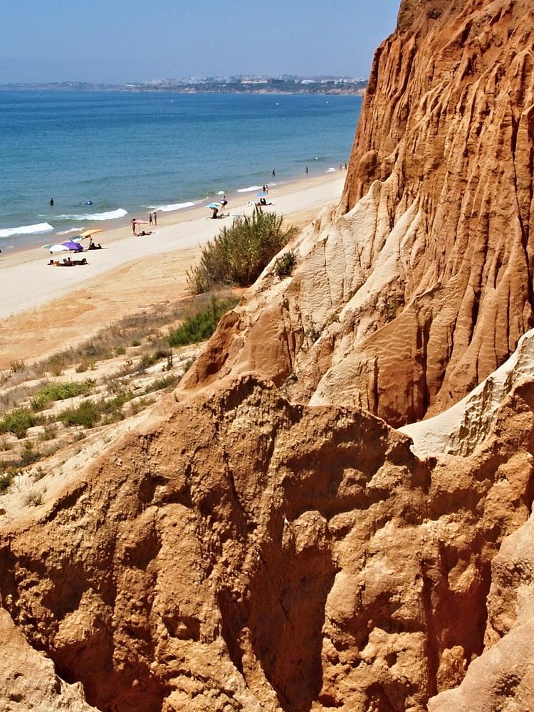 Long sandy beach on the Algave near Albufeira. Bright colours from the sea and the red sandstone cliffs.