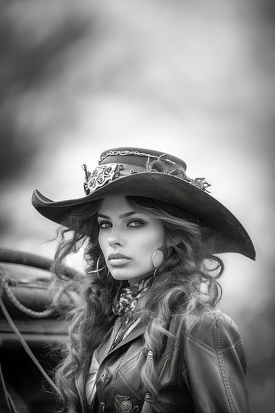 A portrait of a woman in a western outfit with light steampunk accessories in her clothing.