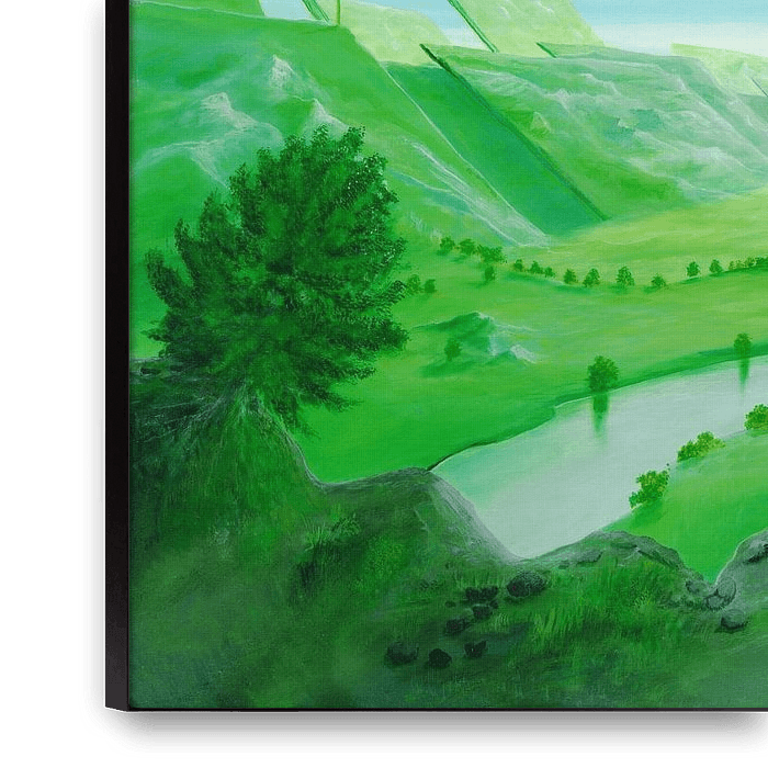 The painting unfolds a fascinating landscape on a high-quality wooden panel designed with acrylic paints. This landscape is divided into three levels. In the foreground, a gentle path stretches between the green rocks, accompanied by a majestic tree on the left. Here, a swing immediately catches the eye, boldly used by a person as he…