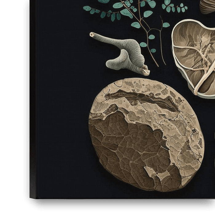 This image shows an intricate collection of fossils, ancient plants and geological specimens carefully arranged against a dark background. In the centre, an ammonite with a spiral shell shows its detailed inner chambers, surrounded by a series of prehistoric marine and terrestrial elements.