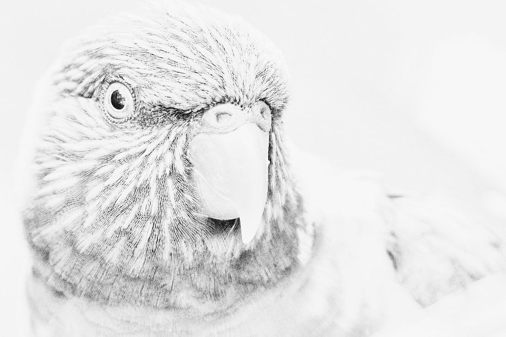 Beautiful black and white photo of a parrot. Friendly, soothing photo. The species is Lori of the blue mountains. A beautiful colourful bird but in this picture I thought black and white was more appropriate. Less is more in this case