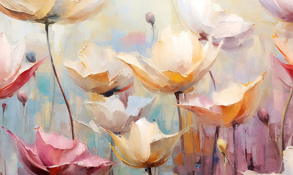 Cheerful abstract painting with wild spring flowers in soft pastel shades.