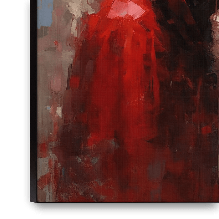 An AI generated image with a modern Little Red Riding Hood portrait. An intense, mystical look. The image has the appearance of being painted with broad brush strokes with oil on canvas. Very decorative, suitable for many rooms.