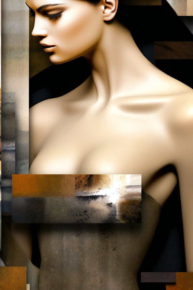 Abstract mixed media collage with the portrait of a woman and a coarse metal texture in warm earth tones.