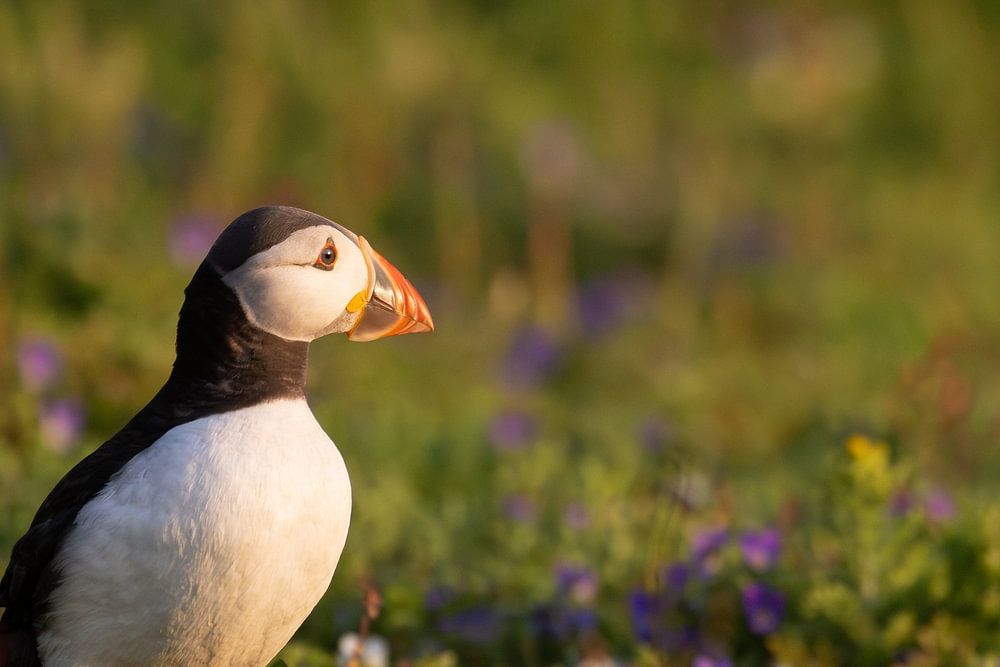 The Puffin, the clown of the ocean, on the island of Skokholm on the west coast of Wales. During the golden hour, the bird was waiting for its mate, gazing nicely into the distance.