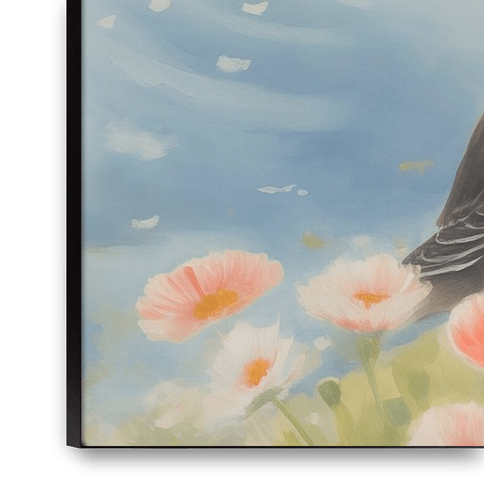 A colourful digital painting of a puffin surrounded by colourful flowers. The work gives a dreamy and classic look to your interior!