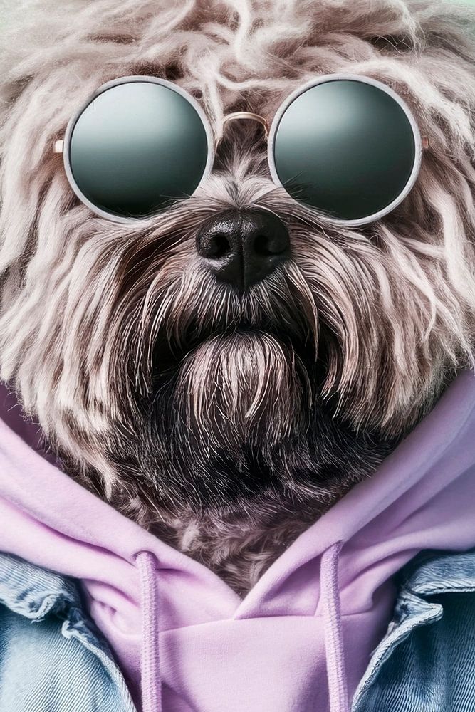 With a wispy, slightly crazy mop of hair and cool sunglasses, this Puli radiates casual vintage style. Snuggled up in a casual hoodie and a trendy denim jacket, he captures the perfect mix of charm and personality. An animal trendsetter that adds a touch of unconventionality to any outfit!