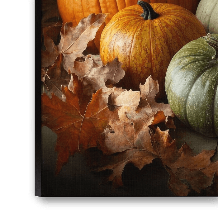 The pumpkins come to life in full splendour in a warm interplay of autumn tones. The bright orange colour of the large pumpkin radiates a vibrant presence, while the soft green tones of the other fruits form a harmonious contrast. Framed by crispy leaves, they embody the essence of seasonal cosiness.
