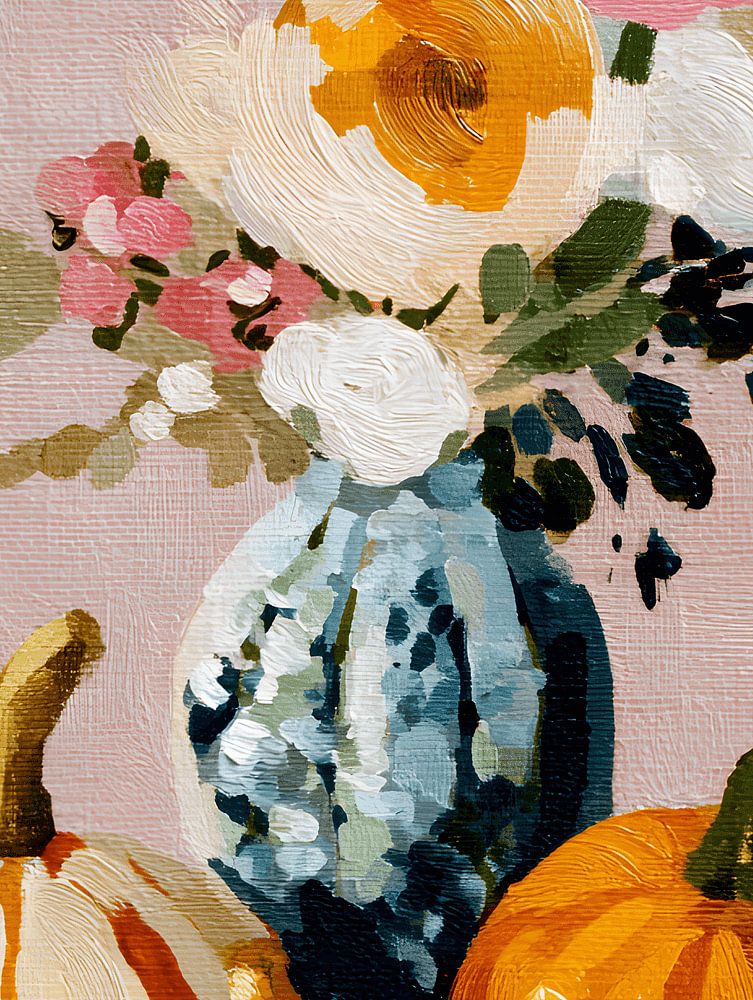 Still life of pumpkins and flowers in soft tones, ideal for autumn decoration.