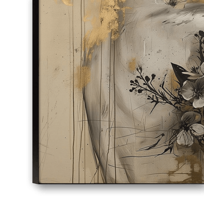 Beautiful woman enveloped in flowers and plants. Constructed from several layers. Use of colour is black and white, grey, gold, beige and white. Ragged thin black threads, corresponding with the black abstract branches complement the whole. Matching various styles and trends.