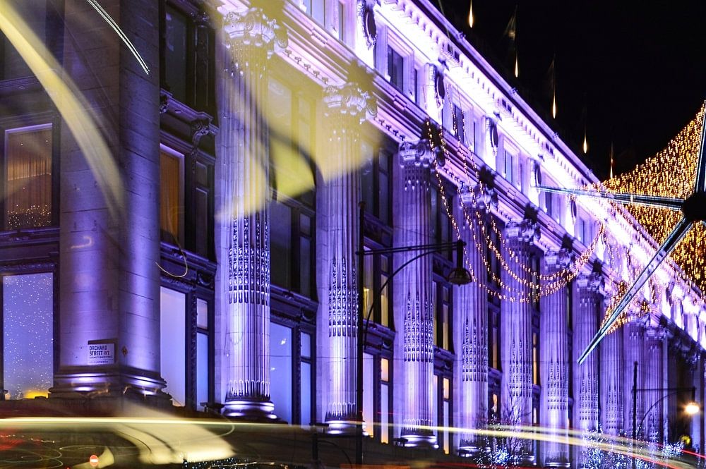 Walking on Oxford Street in the city of London, United Kingdom. We loved these purple Christmas decorations and I decided to create a long-exposure shot showing the passing traffic.