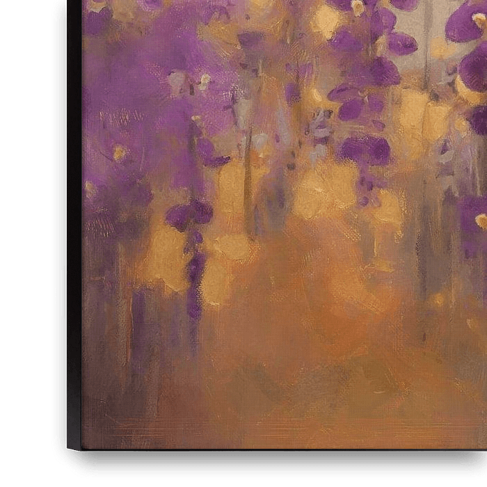 "Purple Flowers on a Golden Background" shows a group of purple flowers against a warm, golden background. The flowers are oriented vertically, making them appear elegant and sophisticated. The golden background enhances the purple tones of the flowers, making them stand out even more.