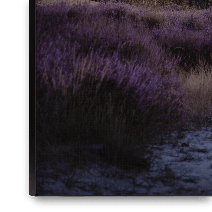 This magical landscape is from the Loonse and Drunense Dunes in North Brabant. It is an enchanting nighttime scene, where the bright purple heather reflects the starry sky. The trees pierce the evening sky, while the full moon illuminates the dunes. A mysterious colour palette, where dark tones of heather, trees and sky merge. The air…