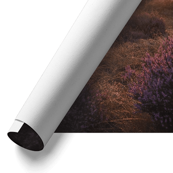 Between two flowering purple heather bushes, an enchanting view opens up: the sun slowly creeps up and illuminates the landscape from behind, making every petal seem to light up. The clouds catch the first light and turn soft gold, like brushstrokes in the sky.