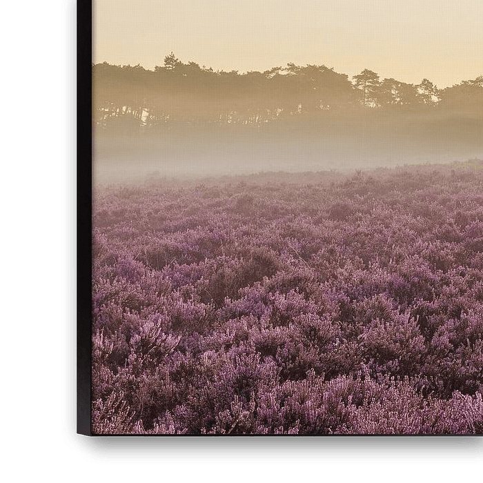 Sunrise in August at the Asselsche Heide on the Veluwe, the purple heather is in bloom. The rising sun combined with a little mist gives a beautiful soft morning glow.