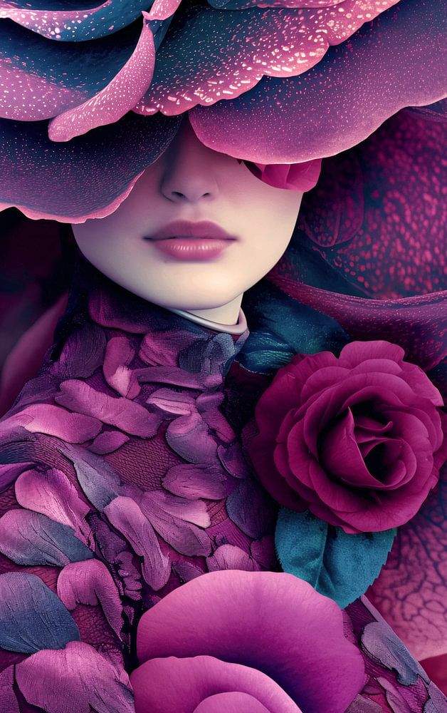 A woman adorned with purple detailed roses exudes a surreal and dreamy atmosphere.