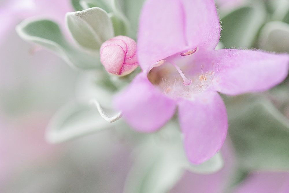 A close up photo of a purple/lilac flower on the Texas Sage plant. An oasis of purple when this plant is in bloom.