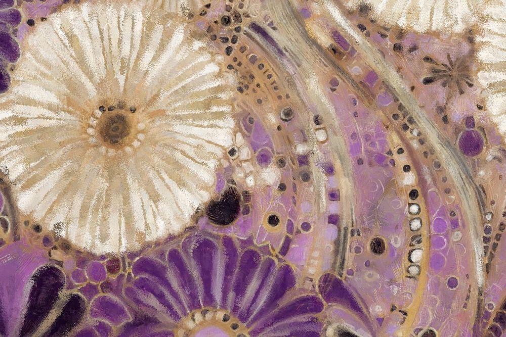 This work shows an arrangement of purple and white flowers filling the entire composition. The flowers are detailed with small dots and lines, forming a rich pattern. The background consists of flowing, wavy lines and soft colours that frame the flowers and create a harmonious atmosphere.