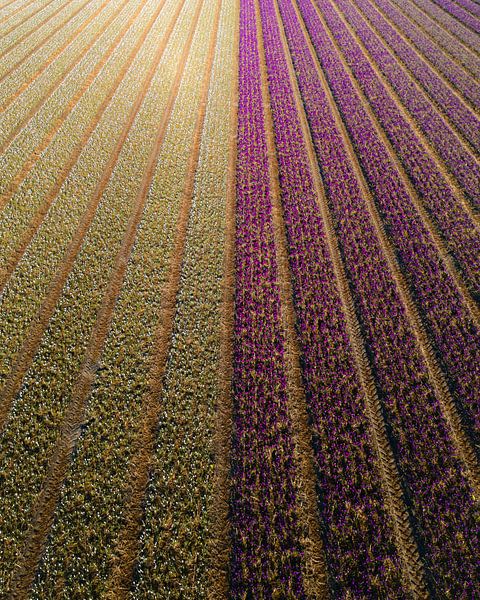 From a bird's eye view, a beautiful pattern of blooming crocus fields unfolds. Long, straight rows of purple and white flowers run parallel across the field, forming an impressive graphic landscape. The contrasting colours create a powerful visual effect, with the lines drawing the eye deep into the image.