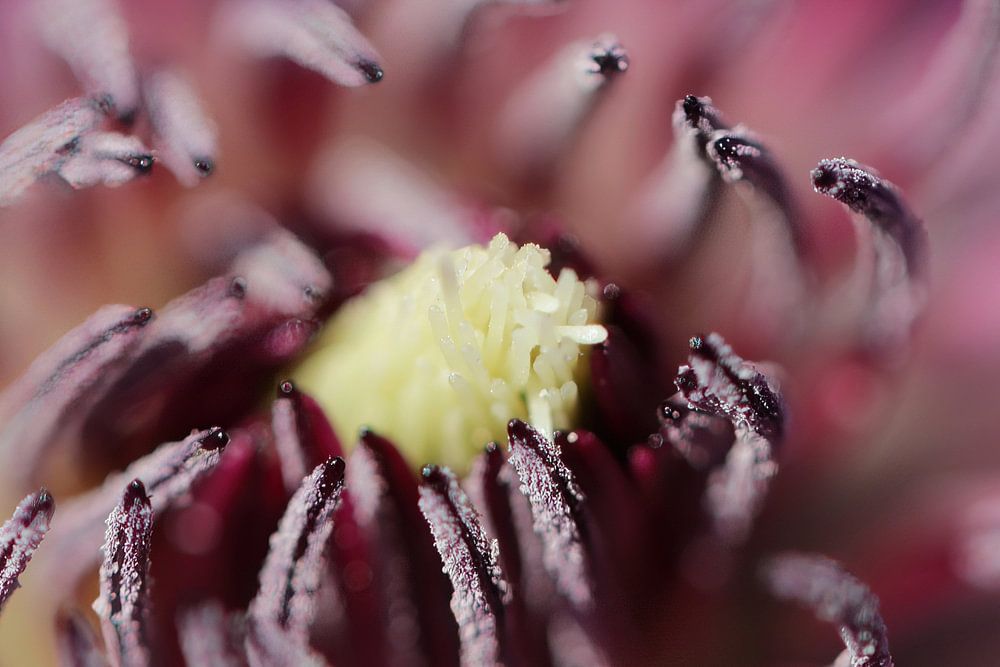 This macro image of the flower of a Clematis flower shows the heart of the flower with the pistil and the stamens.