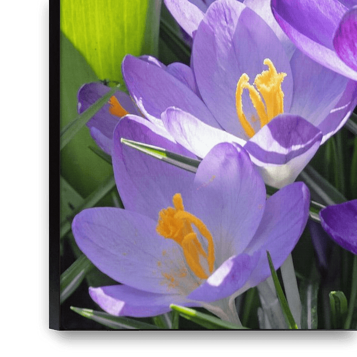 Buy this flower art Purple crocuses and tulip leaves by Katrin May on canvas, ArtFrame, poster and wallpaper, printed on demand in high quality.