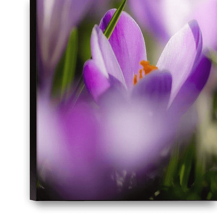 Buy this flower art Purple crocuses in the spring sunshine by Esther Kockelmans on canvas, ArtFrame, poster and wallpaper, printed on demand in high quality.