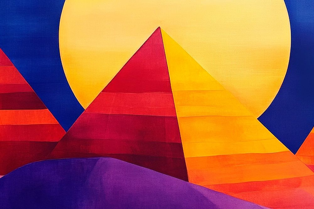 A vibrant play of colours unfolds before the viewer: glowing pyramids rise majestically beneath a radiant yellow sun. The harmonious combination of warm and cool tones lends the room a mystical aura. Perfect for the living room, this work of art invites you to enjoy inspiring conversations and cosy moments.