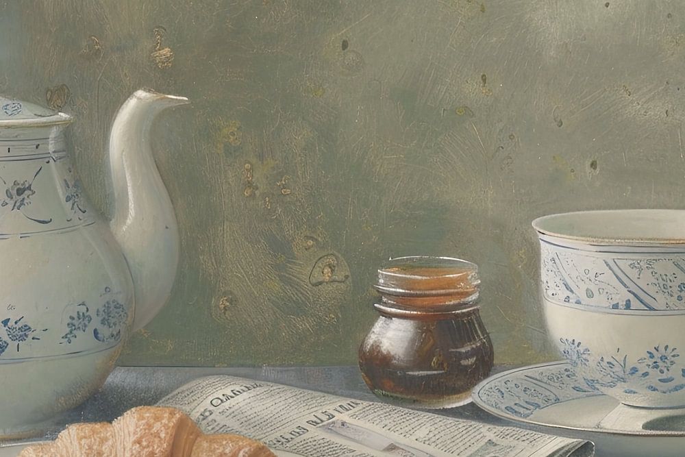 Quiet Beginnings - This still life painting shows an ornately designed porcelain teapot with matching cup, a saucer with a fresh croissant and a small jar of honey, all carefully arranged on an old newspaper, with a quiet, muted green background evoking a sense of early morning calm.