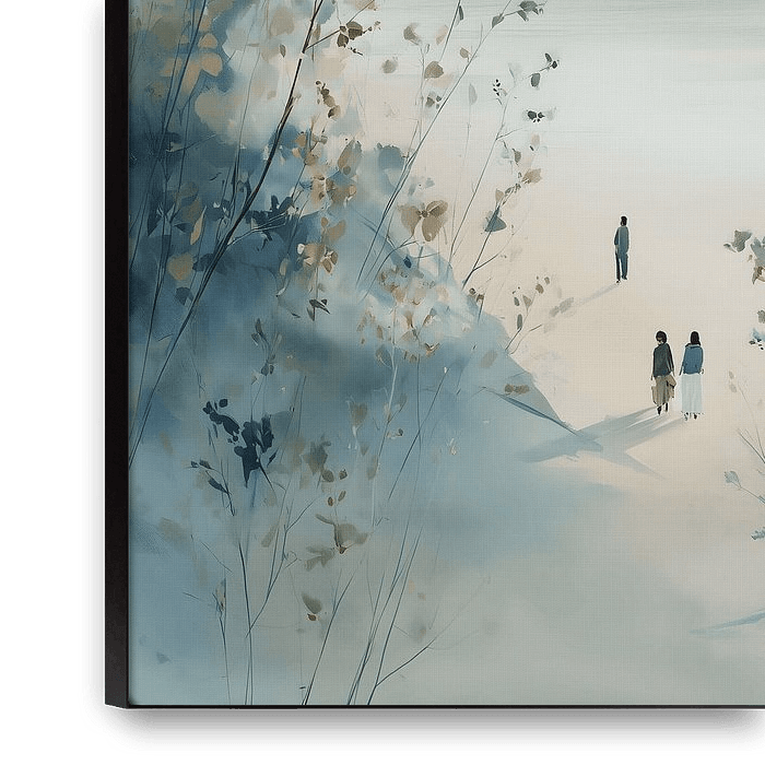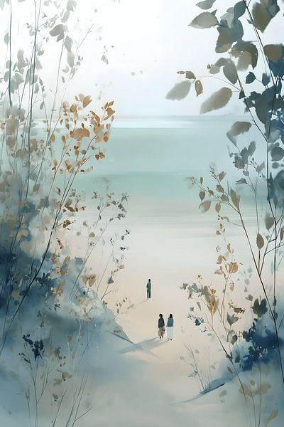 This atmospheric artwork depicts a serene coastal landscape with delicate foliage and distant human figures, painted in soft, muted tones of blue, beige, and green. The misty layers and gentle transitions create a sense of depth, calm, and contemplation. The composition invites the viewer into a quiet moment of reflection, evoking…