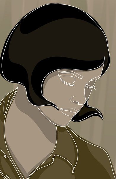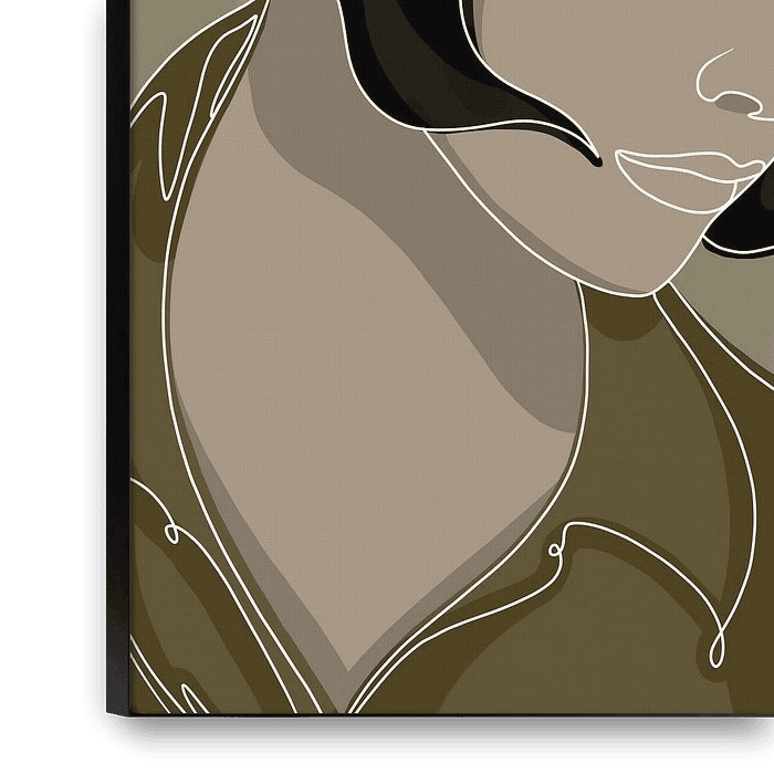 A stylish and understated line portrait that exudes calm and elegance. The minimalist lines and warm, earthy tones create a soft and timeless look, whilst the downward gaze evokes a sense of introspection and serenity. This artwork fits perfectly into a modern interior where simplicity and refinement take centre stage.