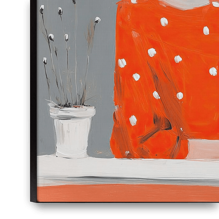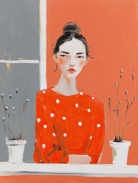 This artwork presents a calm and introspective portrait of a woman positioned by a window, framed by soft interior elements and delicate potted plants. She wears a vivid red sweater with subtle white accents, which immediately draws the eye and creates a striking contrast against the muted grey and warm orange background. The…