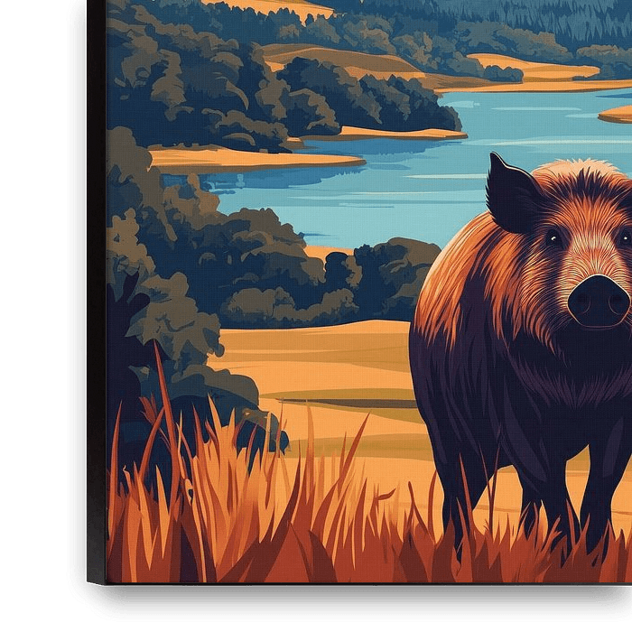 This work shows a wild boar taking centre stage in a picturesque hilly landscape. The animal looks calmly at the viewer while surrounded by a peaceful landscape with vast fields, forests and a calm lake in the distance. The warm tones of the earth and grass contrast nicely with the cool blue tones of the sky and hills. The composition…