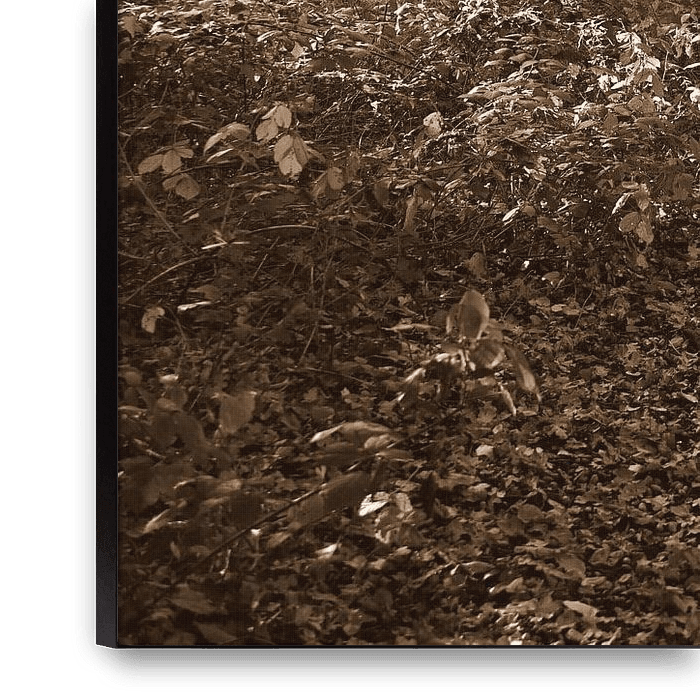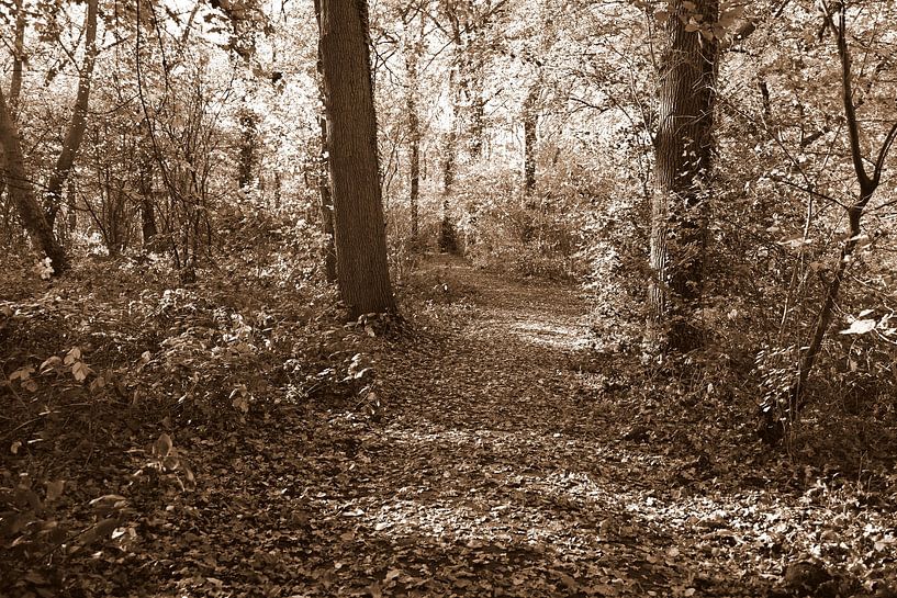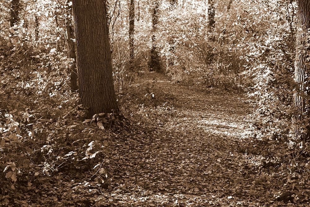 An atmospheric sepia photograph of a forest path surrounded by tall trees and a carpet of leaves. The warm, nostalgic colours give the image a timeless tranquillity, as if you could step onto the path for a moment of silence and nature.