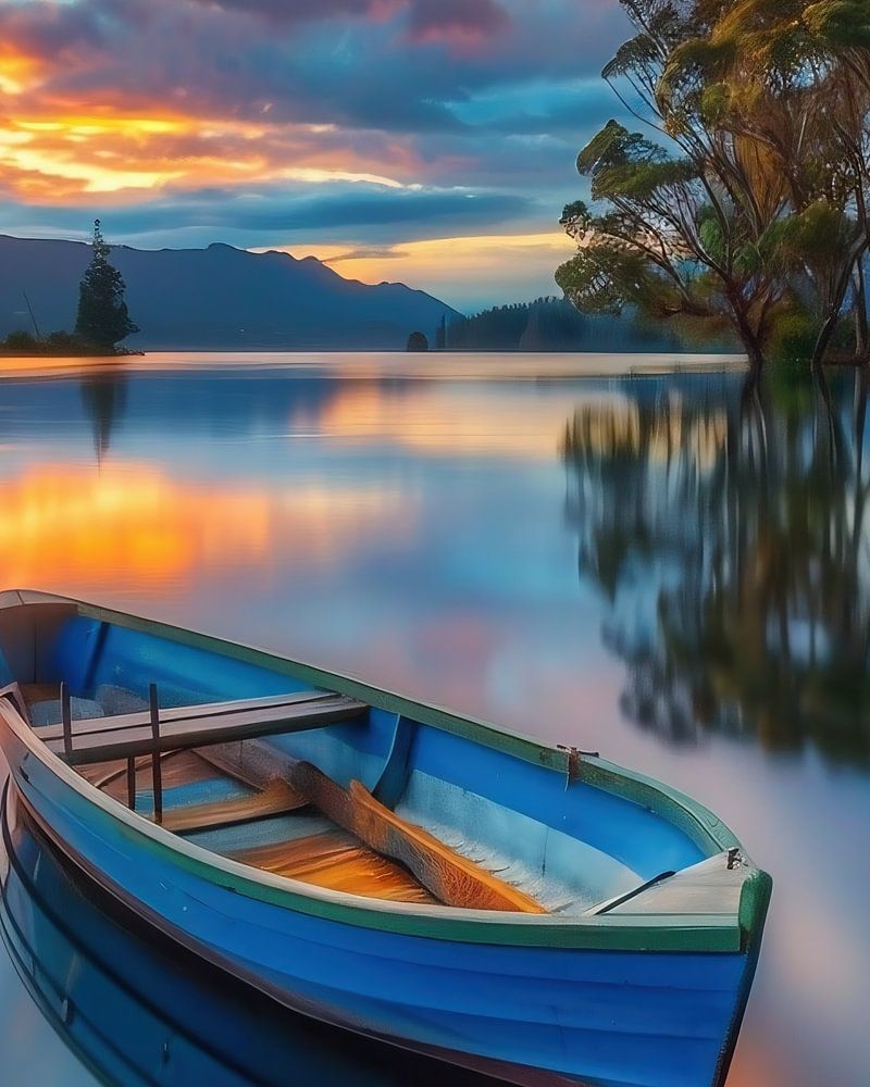 Buy this landscape artwork Quiet boat, calm lake by fernlichtsicht on canvas, ArtFrame, poster and wallpaper, printed on demand in high quality.