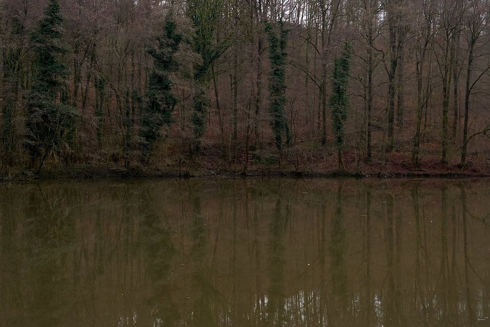 Quiet little lake in the middle of the forest under a grey sky by creativcontent