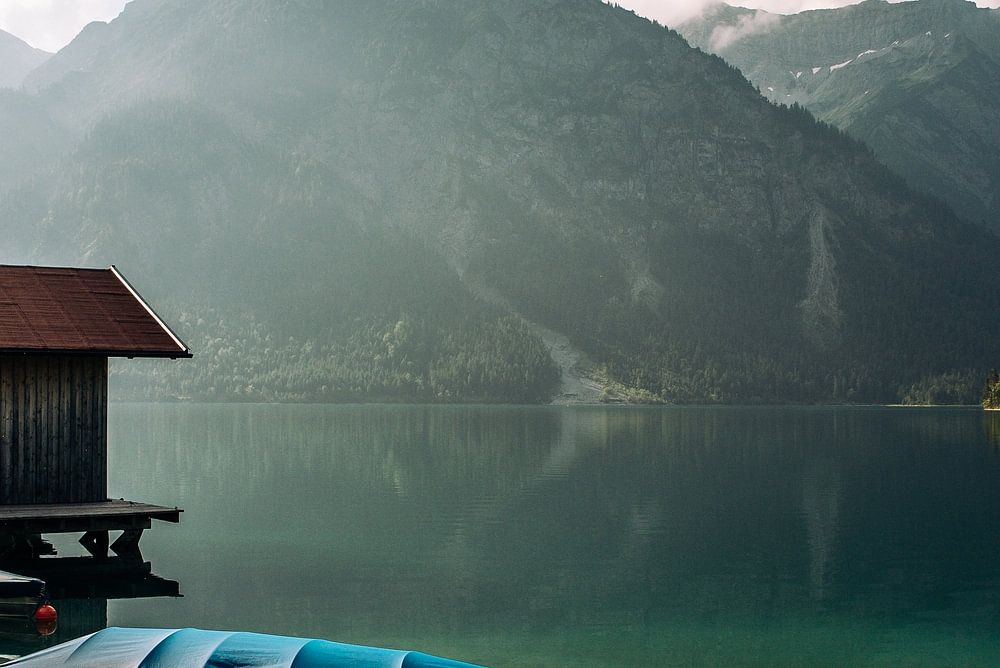 A tranquil mountain lake, surrounded by majestic mountains and dense forest. Two boats lie calmly in the clear, turquoise-coloured water. Mist hangs over the peaks and gentle clouds are reflected in the smooth surface of the water. The landscape radiates sublime tranquillity and invites you to gaze into the expanse of the lake and enjoy the silence of nature.
