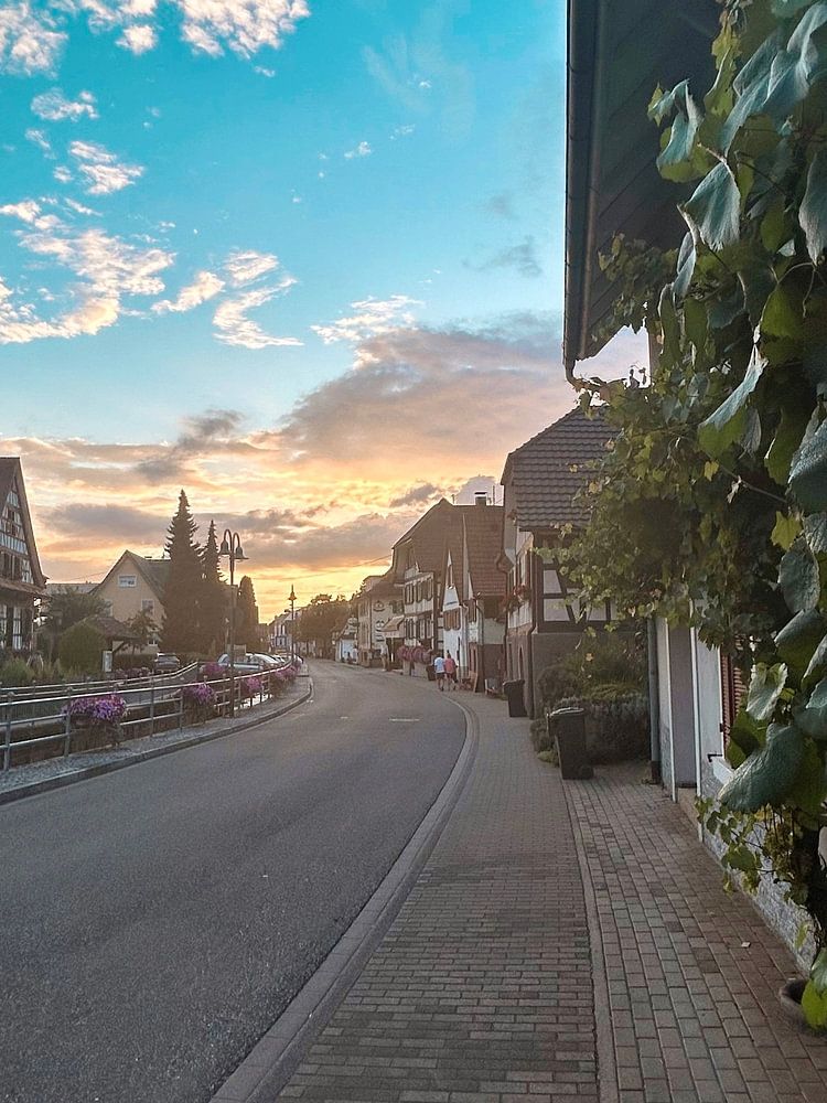This image shows a serene street surrounded by traditional semi-timbered houses with red roofs and white finishes. The sky is clear with a beautiful sunset in the background.