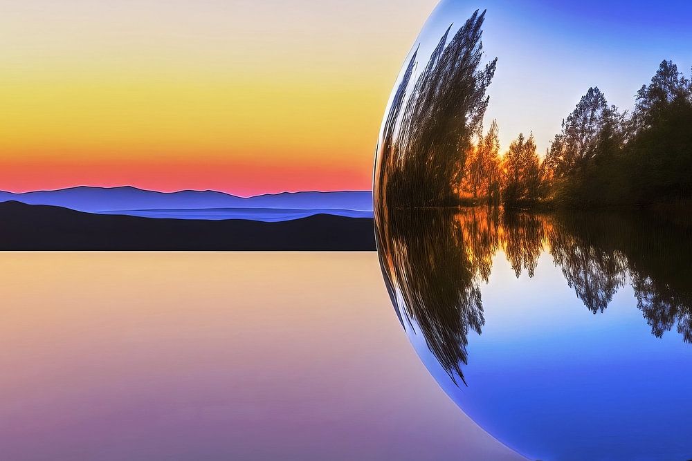 This calming artwork, created using generative artificial intelligence, shows a peaceful sunset over a tranquil lake. The water of the lake reflects the blue sky and clouds in a spherical representation.