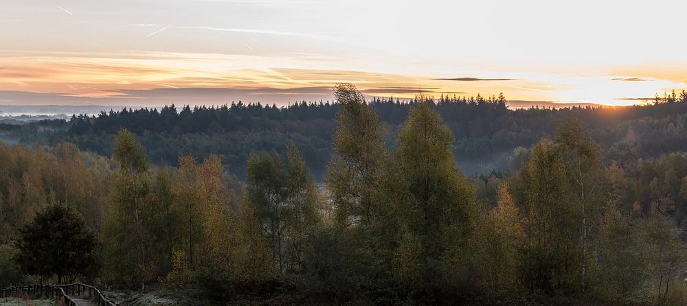Panorama at the nature reserve Kwintelooijen in Rhenen, province of Utrecht, with a view of the grand staircase, the forest showing beautiful autumn colors, and the sun slowly rising.