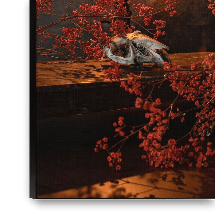 Rabbit skull has been found in the dunes of Texel. The orange flowers are Gipskruid, delicious still life atmosphere. Made on Texel in my own studio. Nice big on the wall like an old painting.