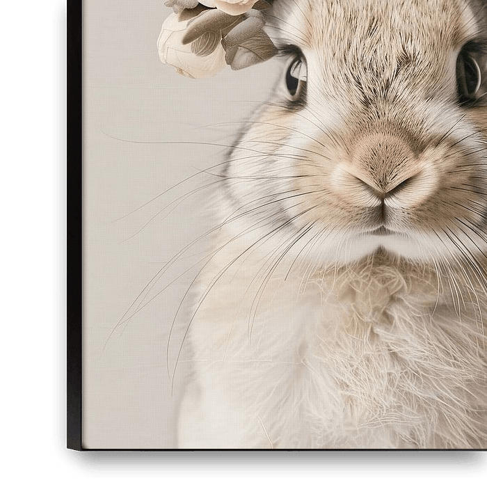 This adorable picture shows a cute rabbit wearing a beautiful wreath of flowers. The soft pastel colours and the detailed depiction of the flowers give the picture an enchanting look. Perfect for the nursery, this photograph brings a loving and cheerful atmosphere to the room. The harmonious colour palette and charming motif make it an…
